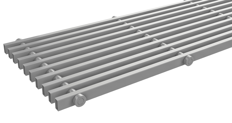 Grille de recouvrement de longueur 100 cm, largeur 26 cm, avec finition acier, de couleur RAL 9006 (gris), grille de type enroulable, pour caniveau chauffant séparé, sans traitement particulier. La dimension de la grille indiquée dans le code de commande correspond à la dimension dans le code de commande du caniveau chauffant auquel la grille est destinée. La dimension nette de la grille est sur demande.