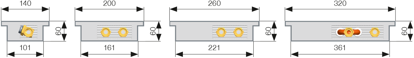 Caniveau chauffant KORAFLEX sans ventilateur, version Thin, longueur 100 cm, profondeur 6 cm, largeur 20 cm, échangeur réversible sans traitement de finition, type de cadre en T pour grille Thin de couleur argent, avec raccordement à droite au système de chauffage, sans bord abaissé.