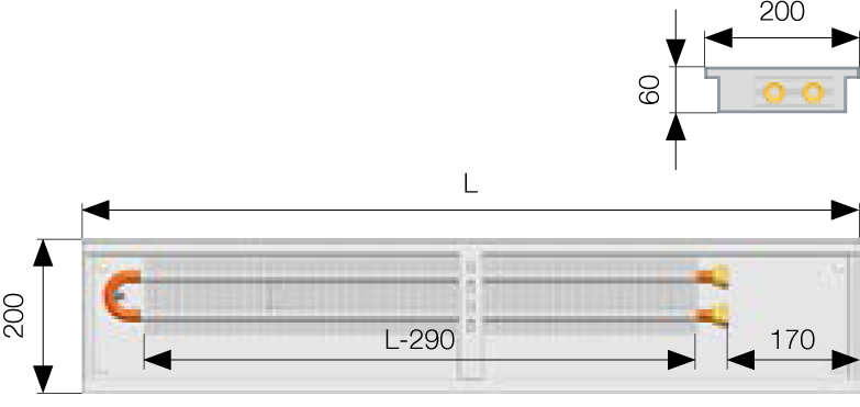 P* – L'échangeur de chaleur monotube continu est utilisé en standard pour les caniveaux chauffants KORAFLEX de largeur 140 mm.