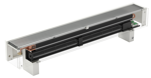 La série de plinthes chauffantes KORALINE Optimal-V LVO hauteur 150 mm, largeur 180 mm est équipée de ventilateurs économiques et performants et d’un moteur électrique avec une puissance minimale afin que les convecteurs atteignent un rendement élevé également avec de faibles gradients de température. De ce fait, ces convecteurs sont le produit idéal à être combiné avec les systèmes de chauffage à pompe thermique. Les convecteurs peuvent être régulés par BMS et, étant donné leur réaction immédiate aux changements de température dans la pièce, leur fonctionnement très silencieux et ils ont une faible température de surface. Ils conviennent non seulement aux maisons familiales et immeubles résidentiels, mais aussi aux espaces publics.